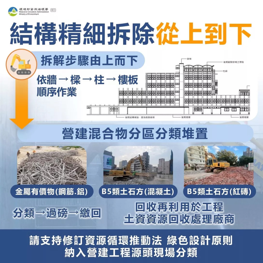 ▲ 結構精細拆除從上到下:把工地變成可追溯的「分區堆置場」(資料來源:環境部資源循環署)